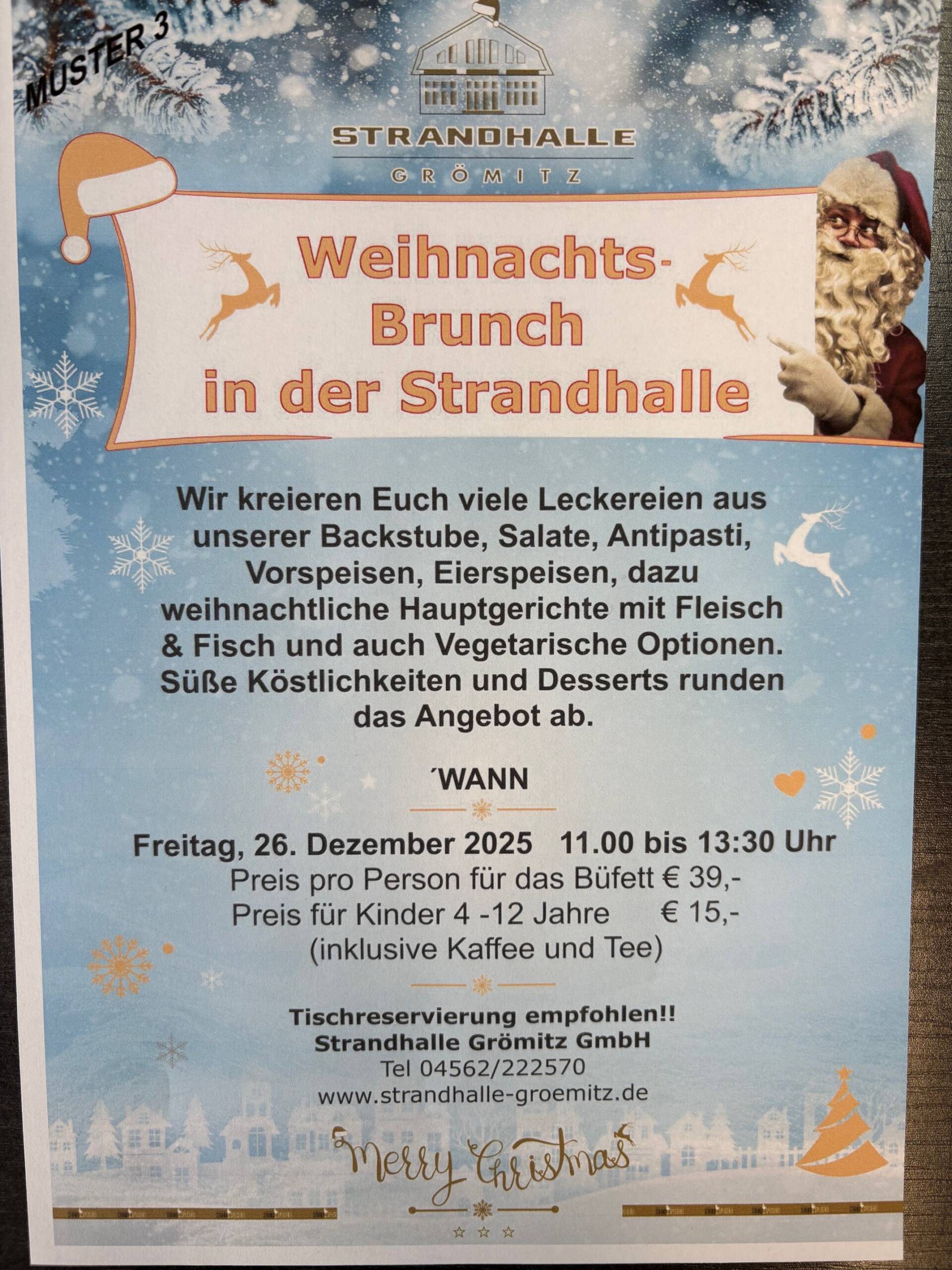 Wir kreieren Euch viele Leckereien aus unserer Backstube, Salate, Antipasti, Vorspeisen, Eierspeisen, dazu weihnachtliche Hauptgerichte mit Fleisch & Fisch und auch Vegetarische Optionen. Süße Köstlichkeiten und Desserts runden das Angebot ab. Freitag 26. Dezember 2025 11.00 bis 13:30 Uhr Preis pro Person für das Büfett € 39,- / Kinder 4 -12 Jahre € 15,- (inklusive Kaffee und Tee) Tischreservierung empfohlen!! Strandhalle Grömitz GmbH